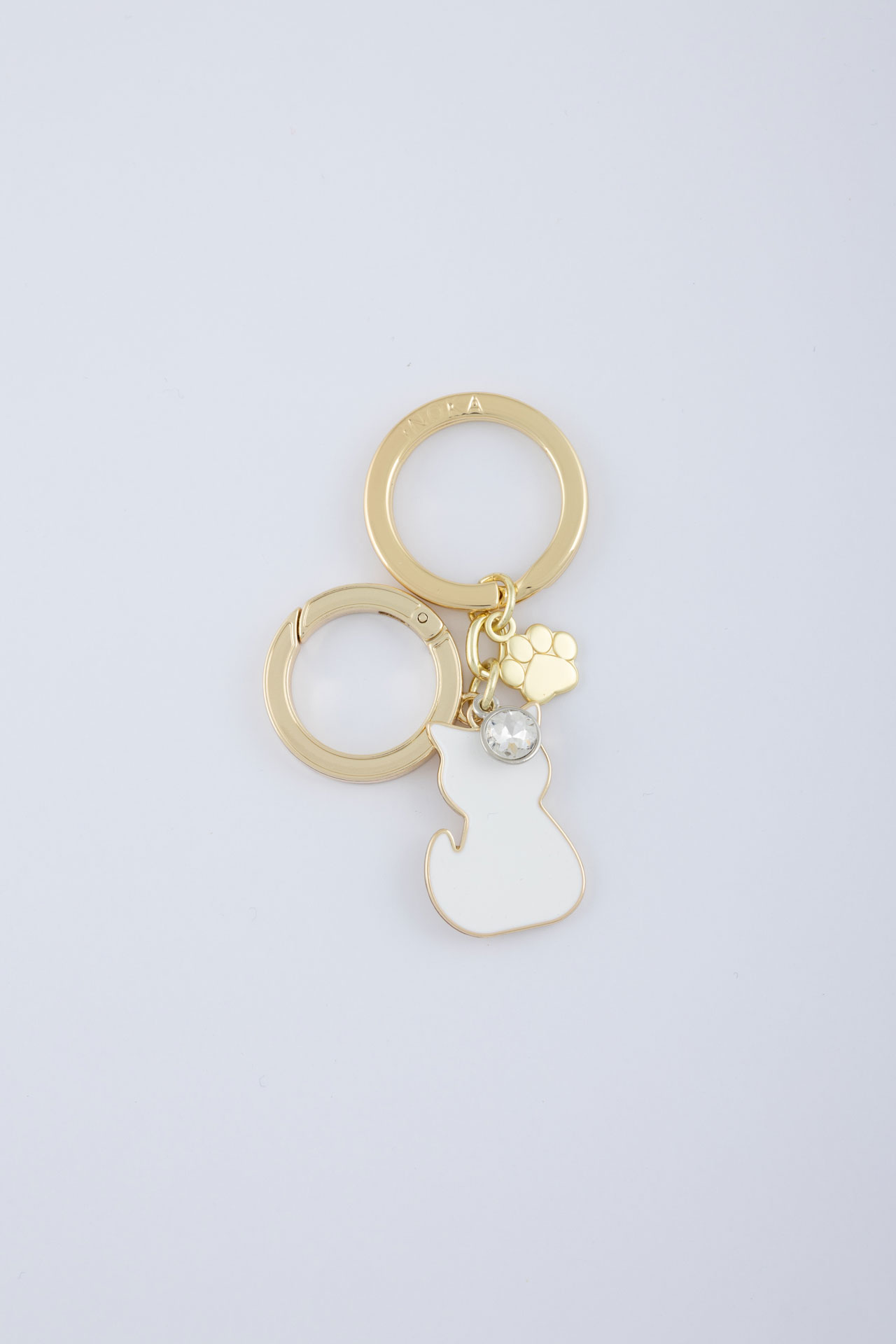 Portachiavi doppio con soggetto piedino in smalto bianco, strass e accessorio color oro.
